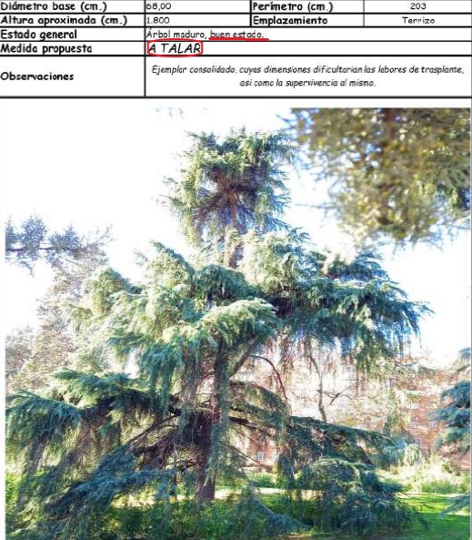 Hola, soy el condenado número 43. Soy un cedro del Atlas y como podéis ver en mi ficha, he podido crecer hasta alcanzar un perímetro de 203 cms y 18 metros de alto. No ha sido fácil, luchar contra la polución de la M30, pero junto a otros compañeros, hemos logrado crecer y nos hemos esforzado en daros protección frente a los humos, los ruidos y el calor. Pero parece que nuestro tiempo ha pasado. Ahora, nos va a sustituir una losa de hormigón con auditorio y quioscos incluidos. Mucho más divertido, supongo.
